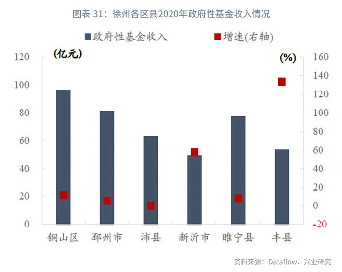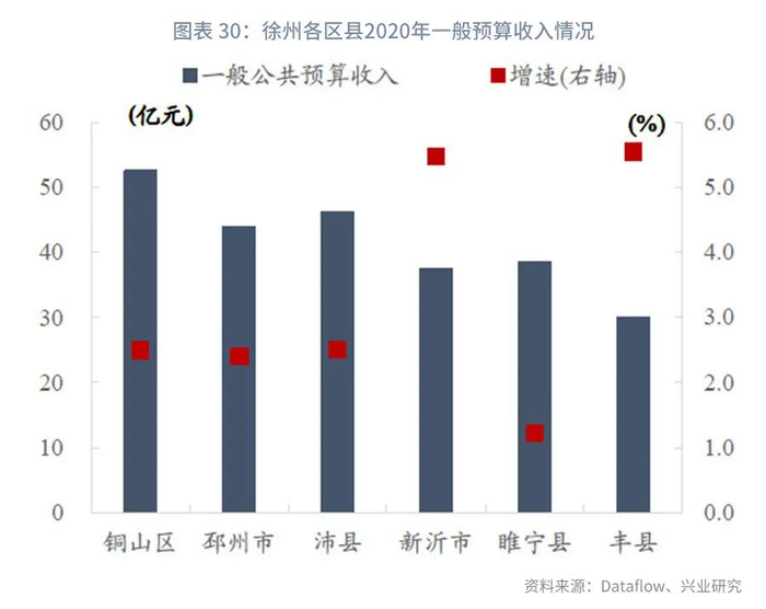 徐州市各区县财政收入规模偏小,2020年一般预算收入全部实现正增长。徐州市下辖6个区县中,丰县一般公共预算收入规模最小,处于全省下1/4分位水平,但增速最高,同比增长5.6%至30亿元;其他5个区县的一般预算收入规模集中在35-55亿元之间,都低于全省1/2分位数。政府性基金收入方面,除沛县外,所有区县均实现正增长。其中,铜山区、邳州市、睢宁县高于全省1/2分为水平;新沂市、丰县规模较小,但增速最高,同比增速分别为57.6%、133.4%。