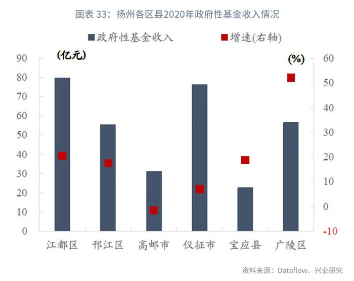 扬州市各区县财政收入规模尚可,2020年一般预算收入全部实现正增长。6个区县中,邗江区、江都区的一般预算收入规模在55-60亿元左右,处于全省前1/4-1/2区间内;其他4个区县的收入规模均低于全省1/2分位数,其中宝应县最低,为25亿元,处于全省后1/4区间内,同比增速仅0.02%。政府性基金收入方面,高邮市是唯一一个增速为负且低于全省1/2分位数的区县,其他区县的收入规模均处于全省前1/4-1/2区间内。