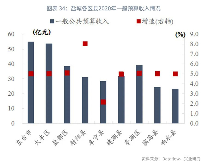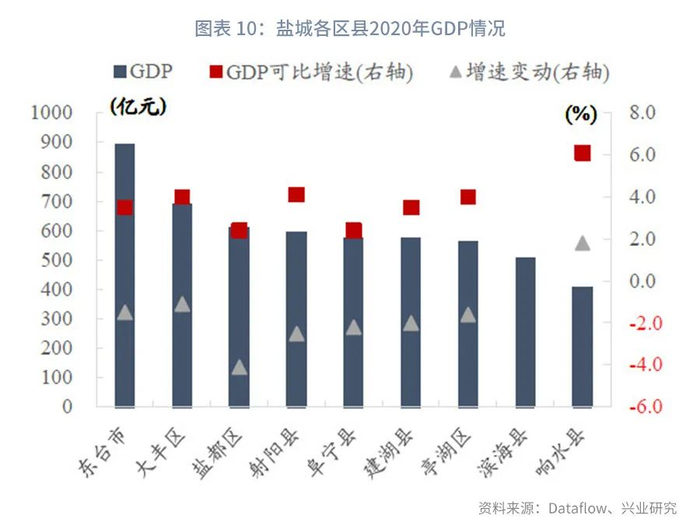 盐城市下辖区县的经济体量普遍偏小,经济增速分化。盐城市下辖9个区县,20年GDP规模均未达到1000亿,仅有东台市以890亿元的规模处于省内前50%,其他区县的GDP规模在400-700亿元不等,其中大丰县、盐都区、射阳县、阜宁县、建湖县和亭湖区处于省内50%-75%,滨海县、响水县则处于省内后25%的区间内。从GDP可比增速来看,响水县因19年基数较低,是全省唯一一个实现GDP增速上升的区县,可比增速位6.2%;射阳县、大丰区、亭湖区的增速在4.0%-4.1%,处于省内中位数水平;东台市、建湖县均处于省内75%分位数水平;盐都区最低,为2.4%,处于全省末尾。