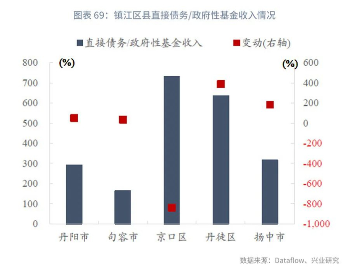 镇江市下辖区县的指直接债务负担整体较重,且上升幅度较大。直接债务/一般预算收入方面,镇江市下辖5个区县中,句容市、扬中市、丹阳市的指标值均高于300%,高于全省3/4分位数,其中扬中市的指标同比上升268.77个百分点,主要系直接债务余额大幅增长所致,其他区县的指标同比变动也大多超过80个百分点,上升幅度较大。直接债务/政府性基金收入方面,除句容市以外,其他区县的指标值均高于全省3/4分位数,其中京口区超过700%,丹徒区超过600%。