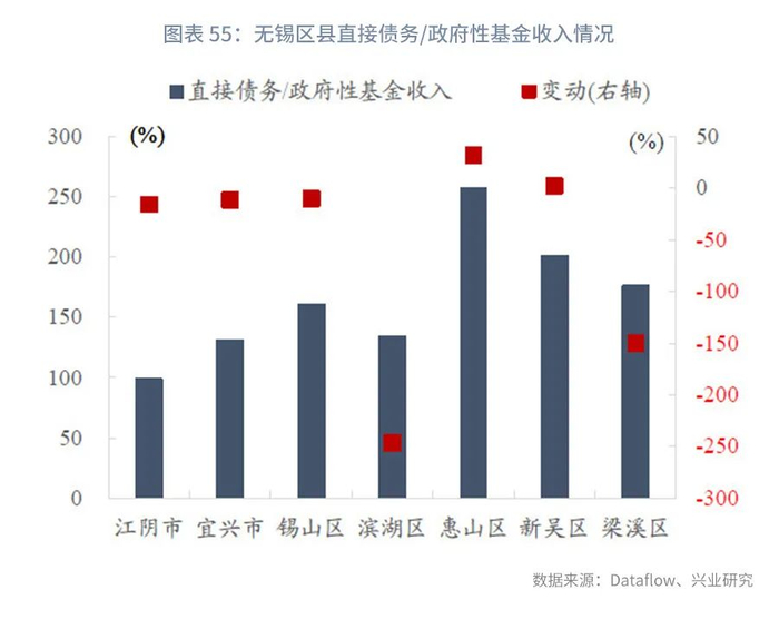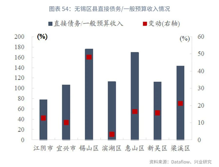 无锡市下辖区县的政府直接债务负担整体较低,从直接债务/一般预算收入指标来看,所有区县的该指标值均优于全省1/2分位数,其中江阴市、宜兴市、滨湖区、新吴区处于全省最低的1/4区间内,西山区、惠山区和梁溪区则处于1/4-1/2区间内。此外锡山区的指标上升幅度较为明显,同比上升48.16个百分点。从直接债务/政府性基金收入指标来看,仅江阴市处于全省最低的1/4区间内,宜兴市、西山区、滨湖区则处于省内1/4-1/2区间内,新吴区、梁溪区处于省内1/2-3/4区间内,惠山区最高且上升幅度较大,指标值达到256.99%,处于省内最高的25%分位数以上,同比上升32.00个百分点,高于省内增幅最大的前25%分位数。
