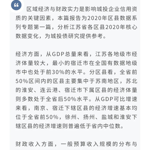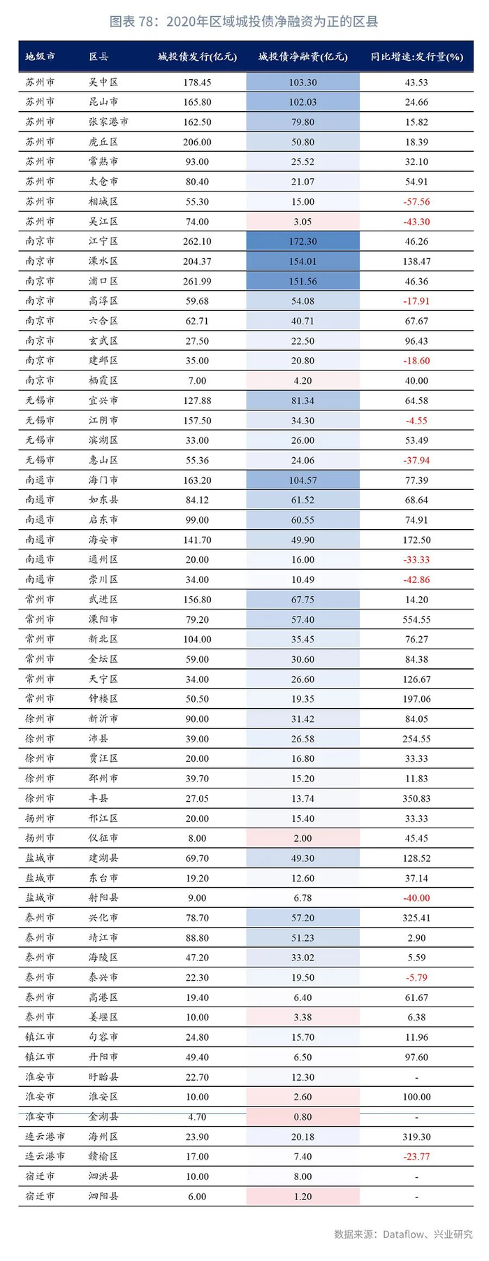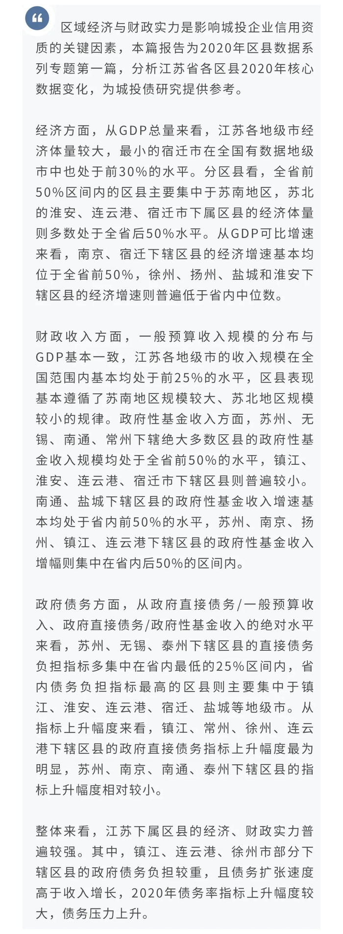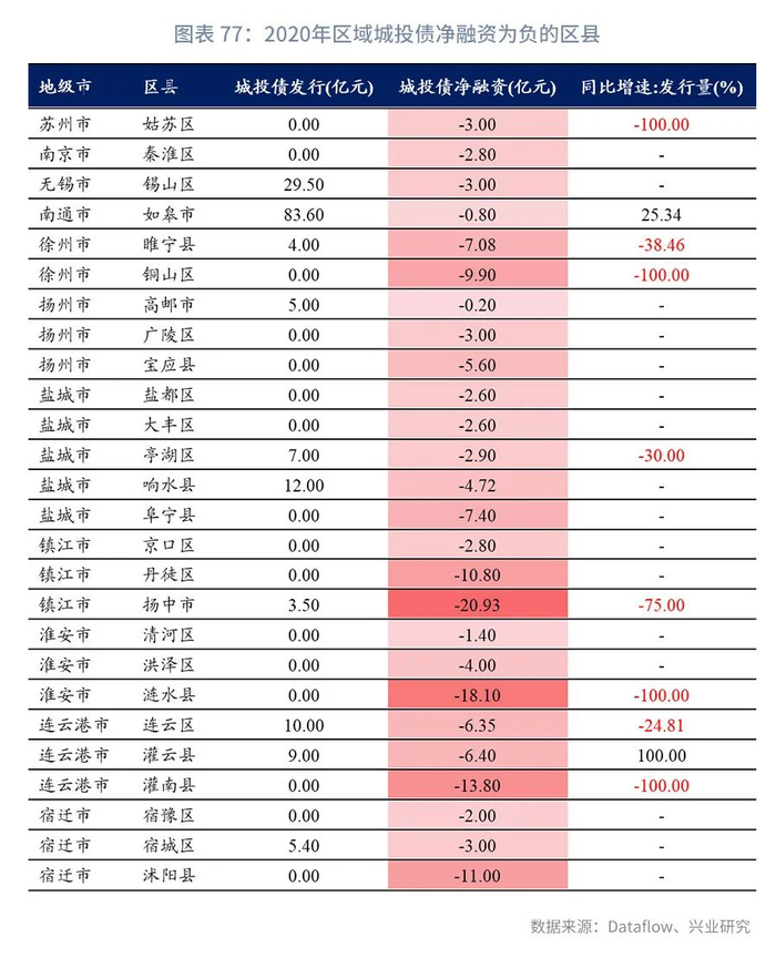 区域城投债净融资为负的区县集中于连云港、徐州、淮安、镇江等经济财政实力较弱或政府债务负担较重的地级市。我们统计了江苏13个地级市、98个区县的城投债融资数据。从地级市层面来看,各地级市2020年的城投债净融资普遍扩大,仅有淮安市略有下滑,南京城投债的净融资接近1000亿,苏州、南通、常州的净融资规模则在300亿元以上;扬州、淮安、宿迁、连云港的净融资规模最低,均低于150亿元,不过镇江市的整体融资环境较2019年已有明显改善,净融资规模由负转正。从区县层面来看,57个区县2020年城投债净融资为正,26个区县出现净偿还。净融资规模最大的区县集中于南京、苏州、常州、南通等省内发达区域,净融资为负的区县则集中于连云港、徐州、淮安、镇江等地级市,其中镇江市扬中市的净融资量为-20.93亿元。