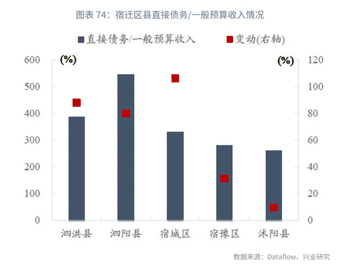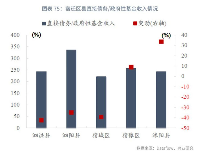 宿迁市下辖区县的直接债务负担普遍较重,且指标上升幅度较大。直接债务/一般预算收入方面,宿迁市下辖5个区县的指标值均超过200%,高于全省1/2分位数,其中泗阳县超过500%,宿城区、泗洪县超过300%,均高于全省1/4分位数。直接债务/政府性基金收入方面,5个区县的指标值同样都超过200%,高于全省1/2分位数,其中泗阳县超过300%,同比下降34.98个百分点,仍高于全省3/4分位数。