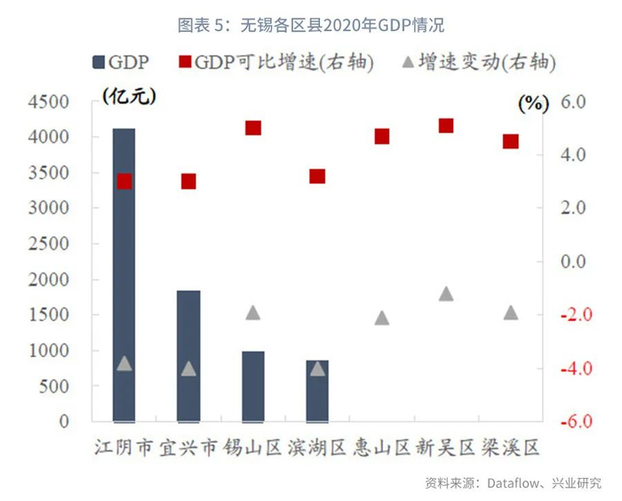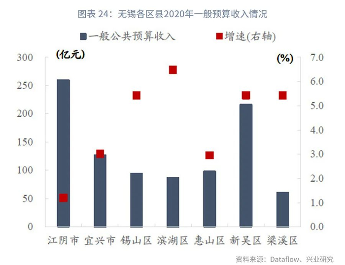 无锡市下辖区县经济体量较大,7个区县中3个尚未披露GDP规模数据,已披露数据的4个区县GDP规模普遍较大,其中江阴市以4100亿元位居省内第二,仅次于昆山市;最小的滨湖区也达到855亿元,处于全省前50%的水平。从可比增速来看,新吴区增速最高,达到5.1%;江阴市、宜兴市最低,均为3.0%,在全省处于90%分位数水平,经济增速偏低。