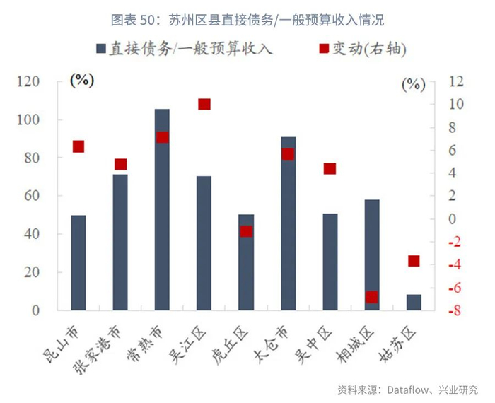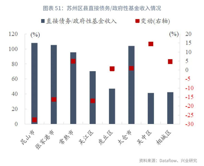 苏州市下辖区县的政府直接债务负担普遍较轻,直接债务/一般预算收入、直接债务/政府性基金收入指标均全部处于全省最低的25%区间内,最高的是常熟市(105.33%)。从债务率变动来看,各区县的债务率指标上升幅度均不大,直接债务/一般预算收入指标上升幅度均优于省内1/4分位数。