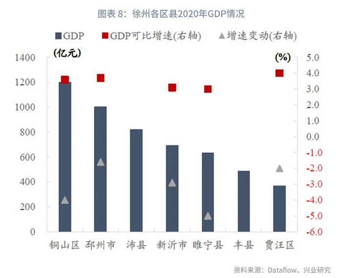 徐州市下辖区县的经济体量一般,经济增速偏低。徐州市下辖7个区县,2020年铜山区、邳州市的GDP规模均突破千亿,其中铜山区为1200亿元,是徐州市内唯一一个处于全省前25%水平的区县;丰县、贾汪区均处于全省后25%的水平。从GDP可比增速来看,沛县、丰县未披露GDP增速,其他5个区县中,增长最快的是贾汪区,增速4.0%,其余区县均处于3.7%及以下,未达到全省平均水平。
