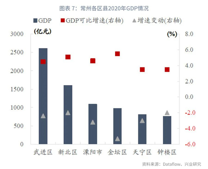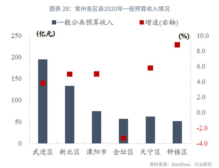 常州市下辖区县的经济体量尚可,增速整体较高。常州市下辖6个区县,其中武进区、新北区的GDP规模处于省内前25%,溧阳市、金坛区则处于省内前50%-25%,天宁区、钟楼区处于省内前75%-50%。从可比增速来看,增速最低的是天宁区和钟楼区,均为3.5%(约为全省70%分位数),其他区县的增速均在4.5%及以上。