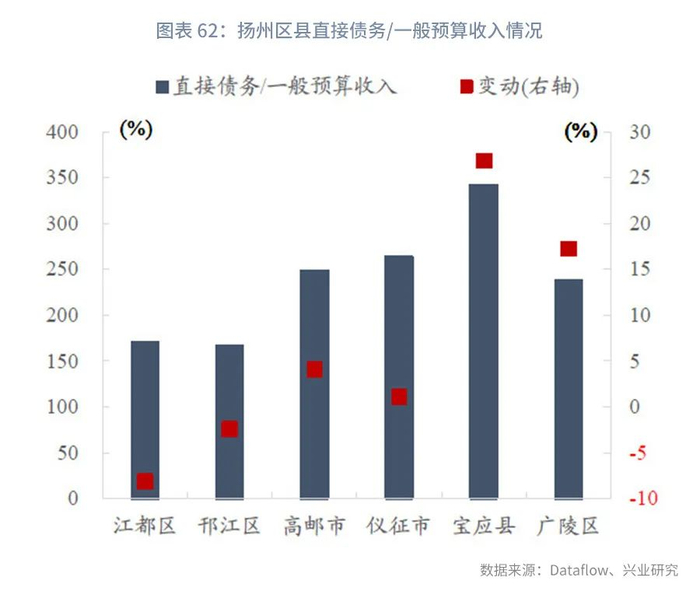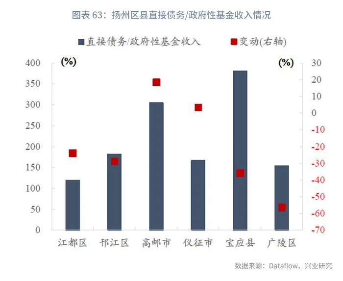 扬州市下辖区县的政府直接债务负担分化较大,其中宝应县直接债务率较高。直接债务/一般预算收入方面,扬州市下辖6个区县中,宝应县的2020年末指标值超过300%,高于全省3/4分位,同比上升26.82个百分点;高邮州、仪征市、广陵区的指标值处于全省1/2-3/4分位水平;江都区、邗江区则处于全省1/4-1/2分位水平。直接债务/政府性基金收入方面,高邮市、宝应县的指标值超过300%,高于全省3/4分位数;邗江区的指标值为181.82%,处于省内1/2-3/4分位区间内;江都区、仪征市和广陵区的指标值均处于110%-170%之间,处于省内1/4-1/2分位区间内。