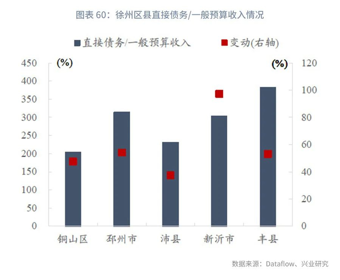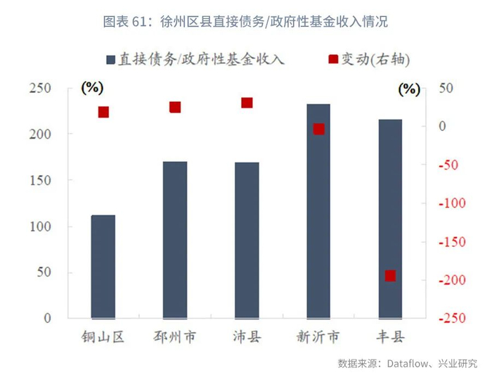 徐州市下辖区县债务负担普遍较重,且上升幅度较大。直接债务/一般预算收入方面,徐州下辖5个曲线中,4个区县的指标值高于省内1/2分位数,其中邳州市、丰县的指标值均超过300%,高于省内3/4分位数;各区县的指标变动均超过35个百分点,上升幅度较大。直接债务/政府性基金收入方面,新沂市、丰县处于省内1/2-3/4分位水平,铜山区、邳州市、沛县则均处于省内1/4-1/2分位水平。
