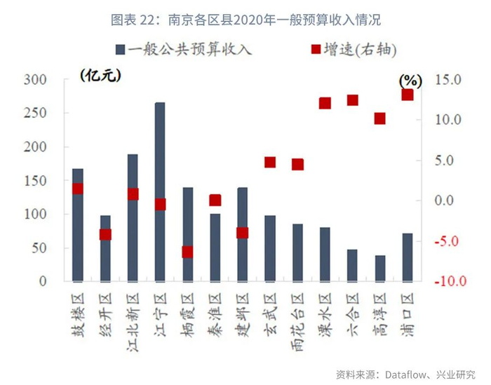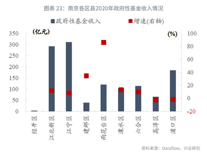 南京市各区县财政收入规模较大,多数区县处于全省前1/4分位,2020年一般预算收入增速呈现出两极分化。其中,江宁区以264亿元的规模位居南京市第一,但同比下降0.5%;而一般预算规模较小的溧水区、六合区、高淳区、浦口区增速均在全省上1/4分位以上,分别为12.1%、12.4%、10.2%、13.1%。政府性基金收入方面,各区县规模分化较大,江宁区以310亿的规模位列江苏全省第2,同比增长8%;江北新区以291亿的规模位列全省第3,同比增长12%;南京经济技术开发区1.7亿的规模为南京市内最低,且与其他区县差距较大。