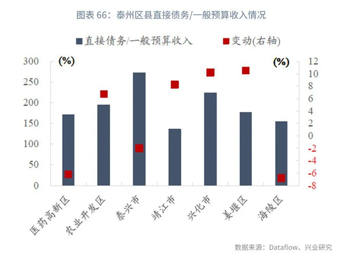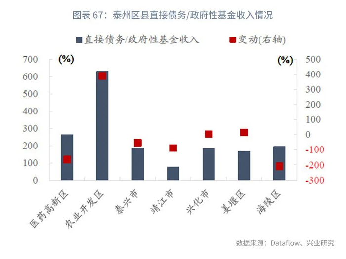 泰州市下辖区县的政府直接债务负担尚可。直接债务/一般预算收入方面,泰州市下辖7个区县中,泰兴市、兴化市2个区县的指标值处于全省1/2-3/4分位水平;剩余5个区县的指标值均处于全省1/4-1/2分位水平,各区县的指标变动都在12个百分点以内,债务率水平变化不大。直接债务/政府性基金收入方面,农业开发区、医药高新区因区域内土地出让较少,指标值高于省内3/4分位水平,其中农业开发区因土地出让大幅下降而导致指标值上升至600%以上;其他区县多集中于省内1/2-3/4分位水平内。