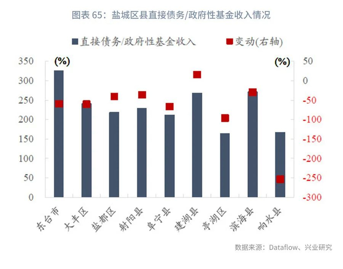 盐城市下辖区县的直接债务负担普遍较重。直接债务/一般预算收入方面,盐城市下辖9个区县中,5个区县的指标值高于省内1/4分位数,其中射阳县的指标值超过500%,阜宁县、建湖县的指标值超400%,响水县、滨海县的指标值超过300%。东台市、亭湖区、盐都区的指标值均超过200%,处于全省1/2-3/4分位区间内。仅大丰区以180.43%的指标值处于省内1/4-1/2分位区间内。直接债务/政府性基金收入方面,7个区县高于省内1/2分位水平,其中东台市、建湖县、滨海县均超过250%。