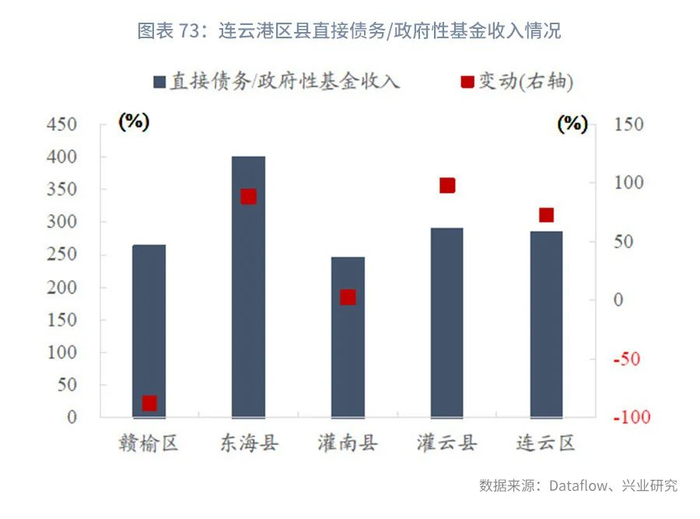 连云港市下辖区县的政府直接债务负担普遍较重,且上升幅度较大。直接债务/一般预算收入方面,连云港市下辖6个区县中,2个高于全省3/4分位数,分别为灌南县、东海县;2个处于全省1/2-3/4分位水平内,分别为灌云县、赣榆区;海州区、连云区的指标值相对较低,优于全省1/2分位水平。直接债务/政府性基金收入方面,所有区县的指标值均高于240%,全部高于全省3/4分位数。此外,赣榆区、灌云县的指标变动幅度均较大,直接债务负担上行明显。