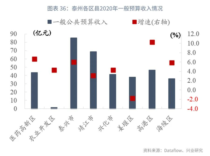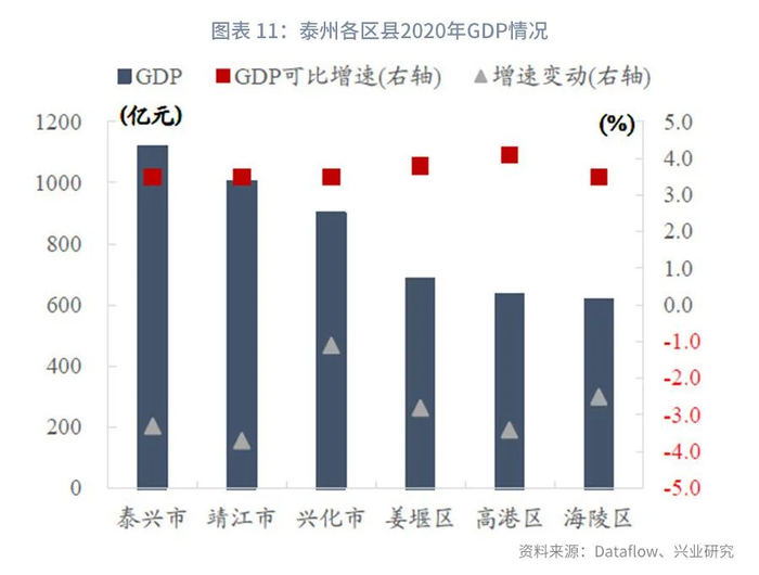 泰州市下辖区县的经济体量一般,经济增速偏低。泰州市下辖区县共6个(未包括医药高新区、农业开发区),仅泰兴市以1120亿元的GDP处于全省前25%区间,靖江市、兴化市处于 前50%,姜堰区、高港区、海陵区都处于前75%。GDP可比增速方面,仅高港区的增速超过全省中位数,其他多数区县的增速均为3.5%。