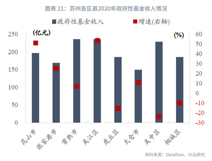 苏州市各区县财政收入规模较大,大多处于全省1/4分位以上,2020年一般预算收入全部实现正增长。其中,昆山市以428亿元的规模位居省内第一,同比增长5.1%;姑苏区一般预算收入规模最小且增速最低,同比增长0.3%至64亿元。政府性基金收入方面,除了姑苏区没有土地出让以外,其他区县政府性基金收入均处于全省1/4分位以上,除虎丘区,吴中区和相城区外均实现正增长。其中,常熟区以236亿元的规模位列苏州市内第一,增速为7%;而吴江区同比增长54%至235亿元位列第二;太仓市政府性基金收入规模最小,同比增长11%至149亿元。