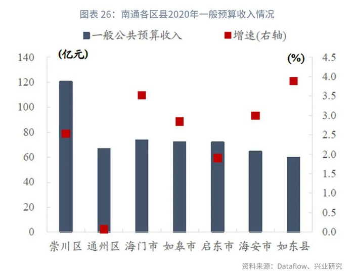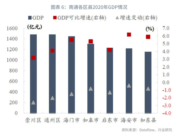 南通市下辖区县经济体量均较大,经济增速普遍较高。2020年南通市下辖7个区县的GDP全部处于1000-1500亿元区间内,基本都处于省内前25%的水平,其中最大的是崇川区(1483亿元),最小的是如东县(1155亿元)。从GDP增速来看,海门市、如皋市、海安市、如东县的可比增速均处于全省前25%水平,通州区和启东市则处于前50%的水平,仅崇川区略低,为3.2%。