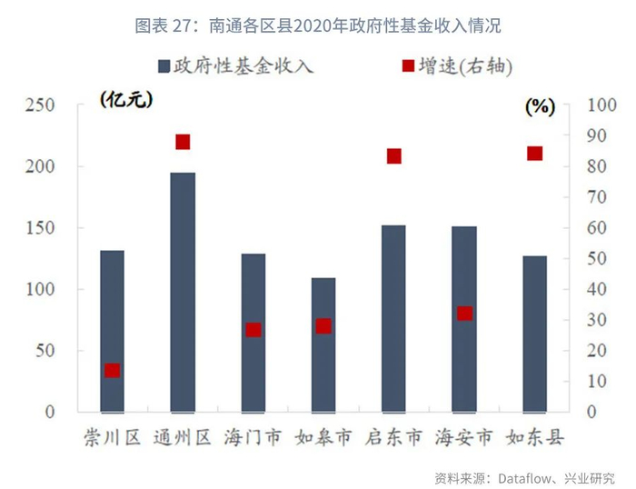 南通市各区县财政收入规模较高,所有区县均处于全省1/2分位以上, 2020年一般预算收入全部实现正增长。其中,崇川区以121亿元的规模位居南通市第一,是市内唯一一个处于全省前1/4的区县;其他6个区县的一般预算收入规模在60-70亿元左右,处于全省前1/4-1/2分位水平,其中如东县一般公共预算收入规模最小,但增速最高,同比增长3.9%至60亿元。政府性基金收入方面,所有区县均处于全省前1/4分位水平,且全部实现正增长。其中通州区规模最大且增速最高,同比增长88%至194亿元;如皋市规模最小,同比增长28%至108亿元。