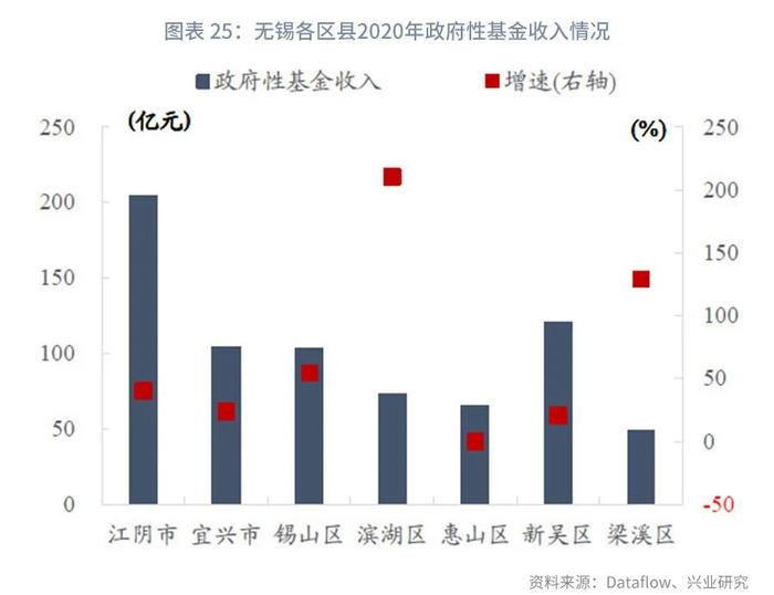 无锡市各区县财政收入规模较大,所有区县均处于全省1/2分位以上,2020年一般预算收入全部实现正增长。其中,江阴市以260亿元的规模位居无锡市第一,但增速1.2%处于全省末尾;梁溪区一般预算收入规模最小,同比增长5.4%至60亿元。政府性基金收入方面,除梁溪区以外其他区县均醋鱼全省1/2分位以上,其中江阴市同样位列无锡市第一,同比增长40%至204亿元,在省内处于前25%区间内;新吴区以121亿的规模同样处于全省前25%。
