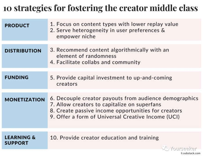 而在前 A16Z 合伙人 Li Jin 看来,平台可以做些事来帮助更多的创造者成为“中产阶级”,思路有五条: