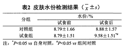经过三个月的实验,测量实验试食组(吃的口服玻尿酸)和对照组(吃的安慰剂)的皮肤水份,结果有略微提高。