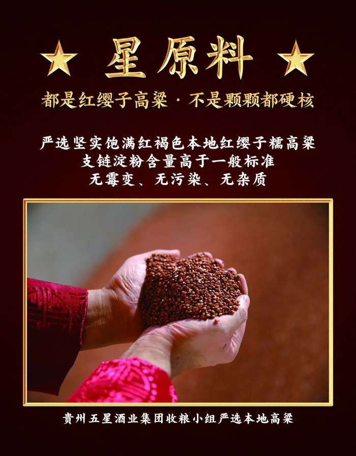 “星”原料。贵州五星集团严选坚实饱满红褐色茅台镇本地红缨子糯高粱,为五星酱酒的品质提供了坚实基础。