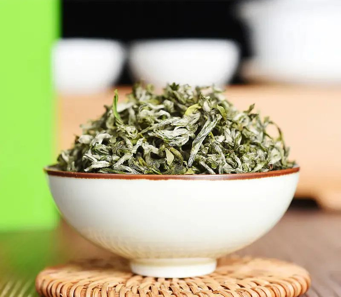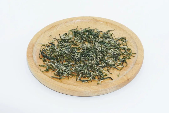 经过繁复筛选后的干茶,色泽银绿,翠碧诱人,卷曲成螺。