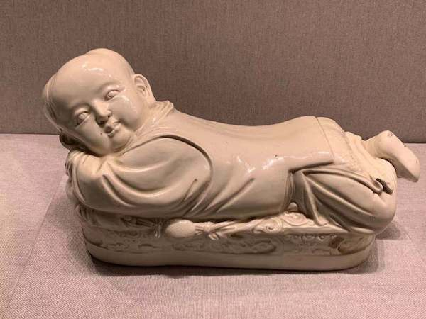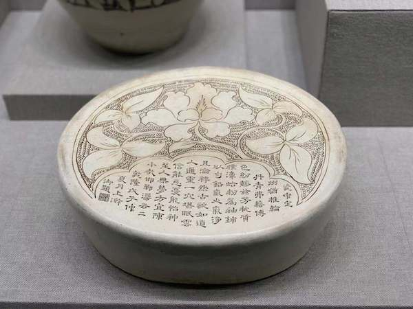 北宋 河津窑白釉珍珠地刻划折枝芍药纹腰圆枕