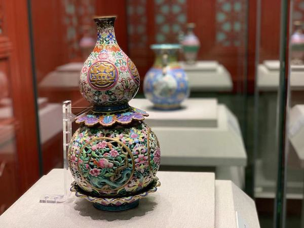 本次改陈在原陶瓷馆十一个主题的基础上增加六个主题,分别展示清代宫廷大婚用瓷、祭祀用瓷、进膳用瓷、陈设赏赐用瓷、宗教用瓷和万寿成套用瓷等,并用辅助景观使观众感受瓷器在清代宫廷的不同用途。这六个主题展品约计一百八十件,其中不少品种是从康熙至宣统朝持续烧造。这些同型、同色、同纹的日用瓷器大批量展出,在故宫博物院尚属首次,既是御用瓷器严格的生产制度的直观体现,也鉴证了清代宫廷生活的方方面面。