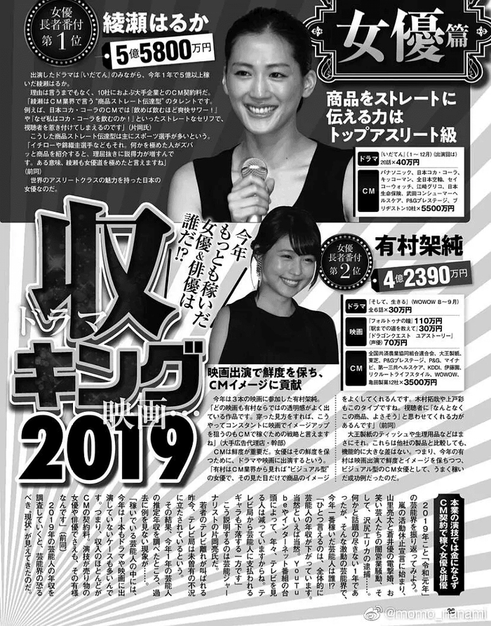 (女演员2019年收入榜单,榜首绫濑遥年收约为3450万元 )