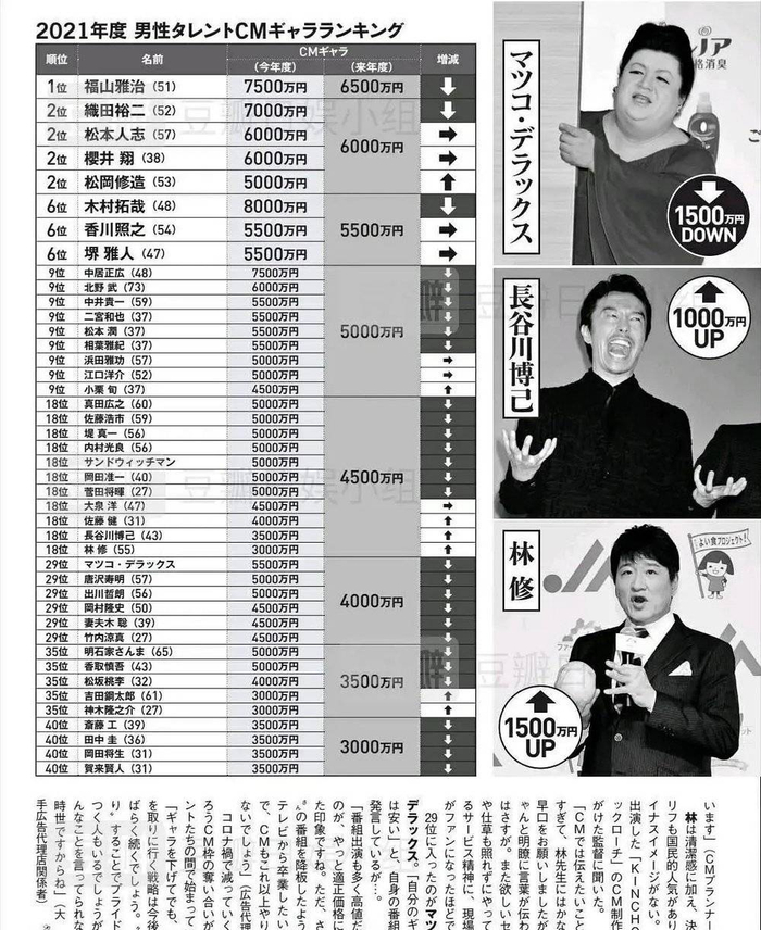 看完了前面的一个个数字,想必大家对于日本明星的收入组成已经有了大体的了解了,小部分的片酬+大部分的广告费+零零散散的通告费,就是一个明星基本的年收入了。(这里仅指明星们通过主业获取的收入,不动产投资等不包含在内)