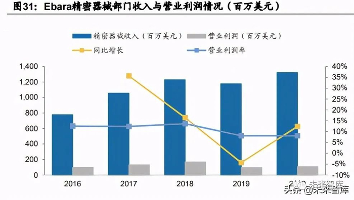 2016-2020年,公司精密器械部门的收入从约7.8亿美元上升到13.2亿美元,年复合 增长率约13.8%,同期营业利润率从约12.5%下降到8.1%,根据公司2020年的年报, 公司精密器械部门的营业利润率的目标为12%。