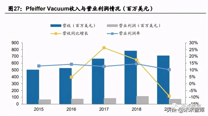 (2)按下游应用领域,与ISTV的分类类似,公司将客户分为半导体(主要使用中大 型支撑泵、涡轮分子泵、测量仪器)、工业(用于电动车、太阳能热发电、冶金、空 调制冷等)、分析测试(扫描电子显微镜等)、科研(泵、质谱仪、检漏仪等,用于 研究所等)、涂层(平面显示、纺织、OLED、LED、太阳能电池等)。半导体为其 中最大的部分,2015年到2019年,半导体行业的收入占比从31.0%上升到35.2%, 最高达38.4%,工业应用从25.5%下降到23.6%,分析测试从20.3%下降到18.7%, 科研行业从10.9%上升到11.9%,期间最高达到过15.1%(2018年),涂层部分从12.3% 下降到10.5%。
