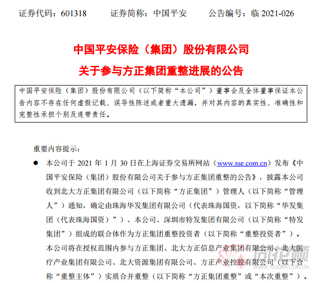 传闻已久的“中国平安参与北大方正集团重组”终于官宣。
