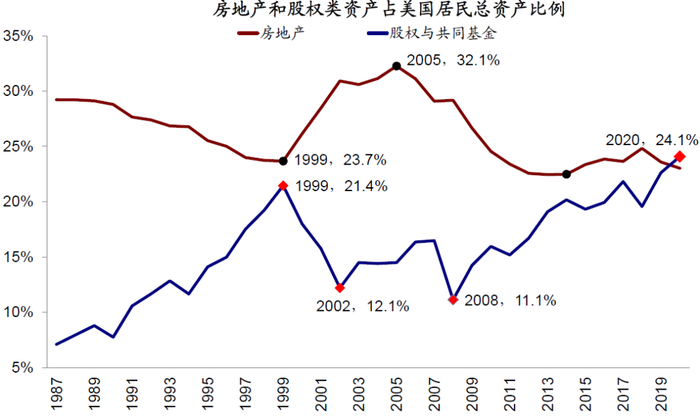 1)2000年科技泡沫前,“股上房下”,科技革命推动股市牛市和配置,储贷危机后房地产持续疲弱。80年代起美股开启了长达20年的牛市,美国居民部门资产负债表中股票及共同基金的占比也从1987年年末的7.1%抬升至1999年年末21.4%。于此同时房地产占比从29.3%下降至23.7%。