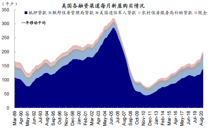 在负债端,在美国抵押贷款是主要的购房融资形式、虽然在金融危机后抵押贷款购房数量瀑布式下滑,但当前占比仍达到了69.0%。居民购房对加杠杆的依赖使得房地产市场空间依赖于居民资产负债表水平。此外杠杆率衍生出的信用质量也是房地产市场扩张的制约因素。信用质量较差的人口进入房地产市场产生大量次级贷款,是2008年次贷危机主要原因之一。虽然仍旧可能存在和2008年类似的信用评价向上偏差,但本轮加杠杆人群主要是高信用质量人群。2020四季度1.05万亿美元贷款中,信用评分高于760的贷款规模达0.84万亿美元,占比高达71.3%,大幅高于金融危机时期的水平(2007年一季度末信用评分高于760的贷款规模占比仅为24%)。我们认为当前居民资产负债情况较为健康。
