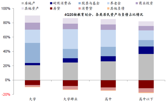 图表: 按学历划分,各类居民资产与负债占比情况