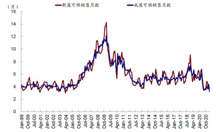 成屋的库存水平是最重要的指标。不同于新屋的先售后建,成屋销售过程中已经有了实体的房屋,且成屋市场总供给量在短期不会大幅改变,因此库存水平就成为成屋供给侧最重要的观测指标。当前成屋库存已经降至历史低位。