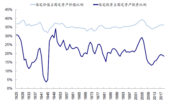 对于整体经济而言,住宅是固定资产的重要组成部分。房地产板块在美国经济中的占比相对稳定,以当前成本计算,2019年美国住宅价值净存量为23.6万亿美元,占比全部固定资产存量高达36%。从增加值角度,房地产增加值占GDP比重为11%~13%,若合并与房地产相关的家装以及相关的租房等服务项支出,那么其占GDP的比例为13~15%,因此仍是经济增长的重要贡献力量。从房地产投资看,2019年住宅投资占美国固定资产投资18%,占GDP比例在5%左右,相对中国较低(2020年10.2%)。