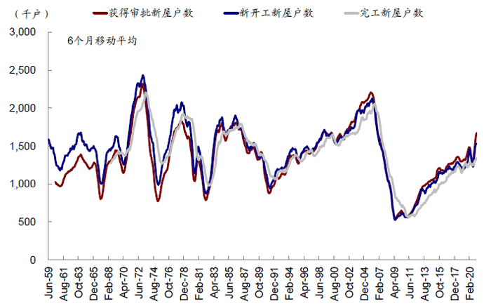 新屋供给和成屋供给是地产供给的两个系统,其中新屋供给需要关注审批(authorized by building permit)、开工(starts)、施工(construction)和交付(completion),这一系列流程与设备投资、制造业产能和库存相关,同时会拉动美国对外进口。成屋供给主要关注成屋市场库存余量,同时会受到房屋从出租和出售交易市场流动以及新屋出售余量带来的慢变量影响。
