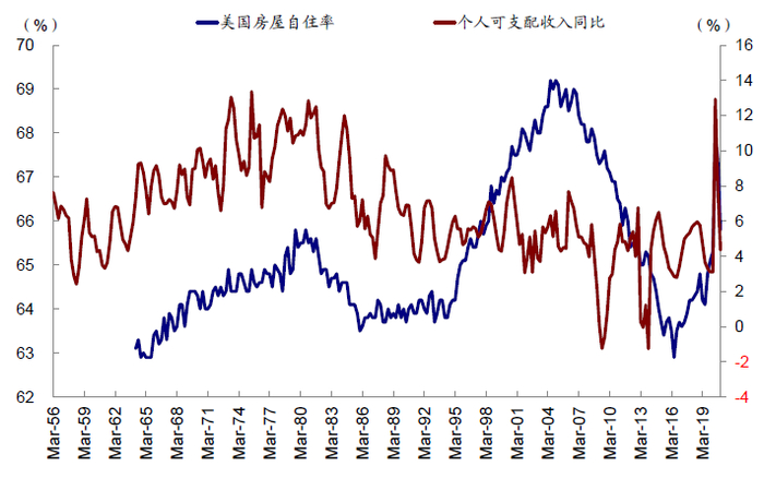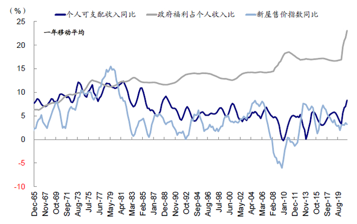 个人财富和杠杆水平高低决定需求是否可以转化为购买行动。在资产端,提升的个人可支配收入能够将购房需求转化为最终的购买行动。长周期看,个人可支配收入和房屋价格高度相关。同时,在经济复苏阶段,政府的转移支付通常会大幅增加以补充个人工资收入下滑的缺口,因此经济复苏下房地产市场通常能快速回暖。例如,本轮疫情下美国个人可支配收入实际上不降反升,2020年四季度美国个人可支配收入同比增速达到4.4%,而2020年二季度更是达到12.9%的高位,而政府转移支付占个人收入比从2019年末的16.8%大幅提升至2020年二季度27.8%的高点,为疫情后地产热提供了条件。