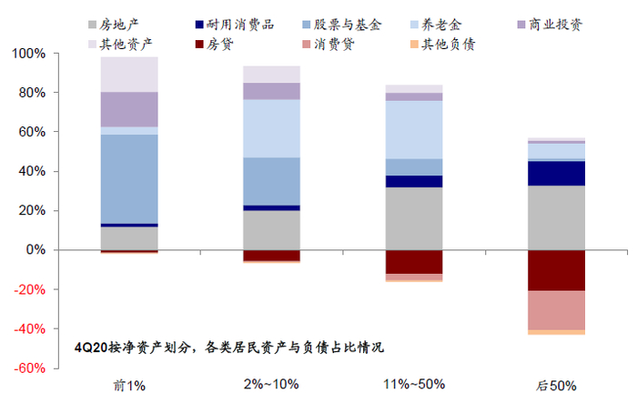 图表: 按净资产划分,各类居民资产与负债占比情况