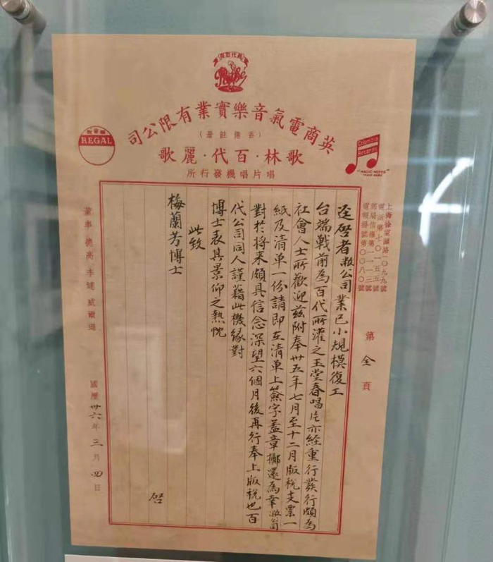 当年,不肯为日本人唱戏的京剧表演艺术家梅兰芳蓄须明志、息影舞台,举家留居香港。而早年他在百代公司录制的《玉堂春》唱片重新发行后,百代公司在1947年为补发版税致函梅兰芳。百代小楼的展陈上,一张泛黄的函件和版税支付通知,让参观者更直观地见证了梅兰芳的爱国情怀,也显示出百代公司的良好商誉。