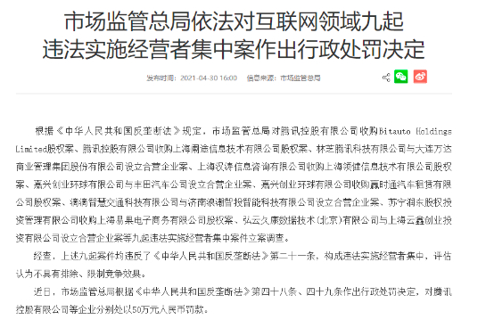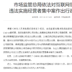 4月30日,市场监管总局根据《中华人民共和国反垄断法》第四十八条、四十九条作出行政处罚决定,对腾讯控股有限公司、滴滴智慧交通科技有限公司、苏宁润东股权投资管理有限公司等企业分别处以50万元人民币罚款。