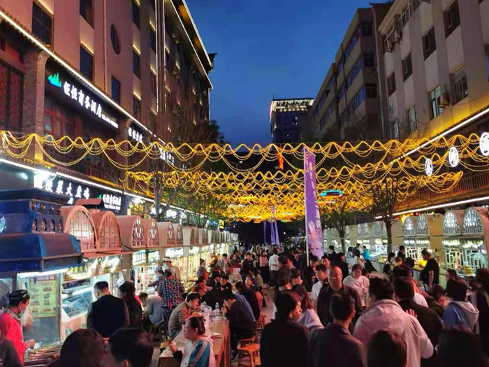 下午六七点,这里一百多个商户支起摊位,羊蹄、羊杂碎、洋芋擦擦、洋芋沫沫、杂面等三十多种特色小吃冒着热气。街道人流如织,直到凌晨两点依旧灯火通明。