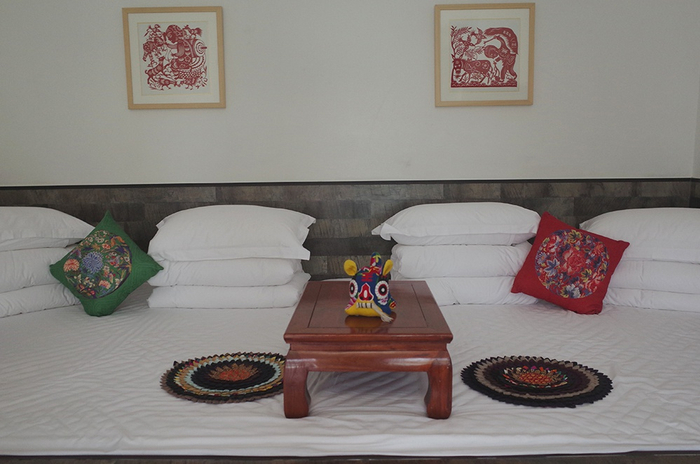 “大到喝茶的桌椅,小到墙上的剪纸,都是找专门手艺人做的。”小雅指着“炕”上的花坐垫说,这也是拿小孩不穿的布帛缝起来的,展现陕北特色的“百家衣”风格。陕北炕比较冰冷,她们就用木头把炕包起来,再铺上软垫。现在,民宿请的保洁阿姨都是村里的人,有什么问题也能叫上村里人帮忙。“一方面节省了成本,一方面也解决了一部村民的就业问题。”