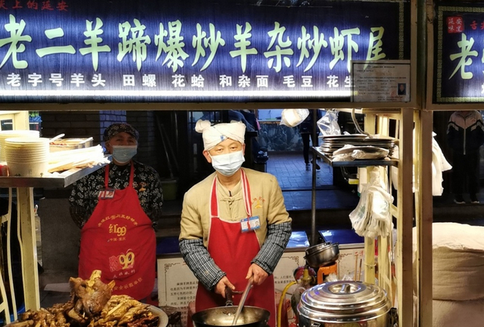 在二道街夜市卖杂面和羊蹄的摊贩老李告诉澎湃新闻,他家庭条件不好,常年在西安打工,但“外面挣不到钱,最后还是回了老家”。2009年,他开始在二道街摆摊,算是第一批做夜市的。“但那个时候还是流动摊贩,后来慢慢正规化了,有了固定的位置,赚的钱也多起来了。”