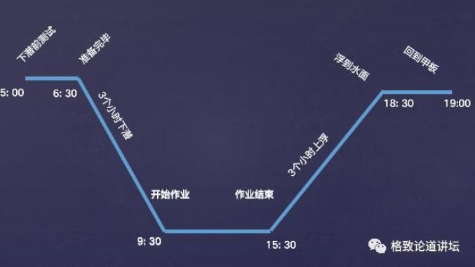 刚才提到,万米潜次的时间很长。那么到底有多长呢?下图给出了一个数字,大概是14个小时。因此,早晨5点钟就需要大家到潜器间做准备。为了不迟到,大家前一天晚上通常都要定好几个闹钟。