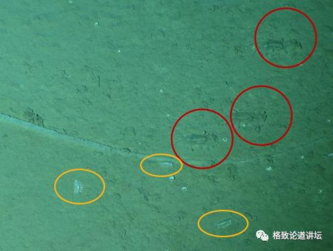 生机盎然的万米海底(红圈内为海参,黄圈内为多毛类生物)