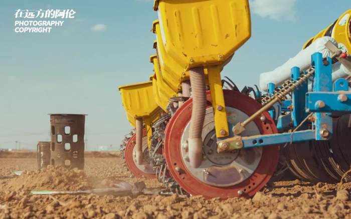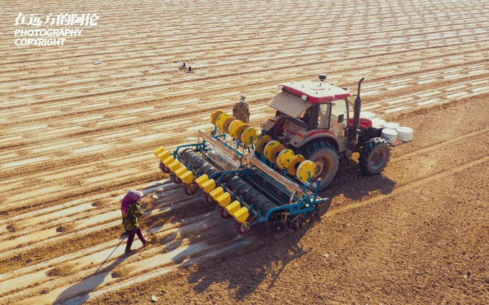 我在昌吉偶遇这家普通农户时,正赶上他们2021年的第一天播种。通过北斗定位,播种、安放滴灌带、覆膜一次完成。