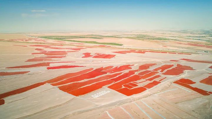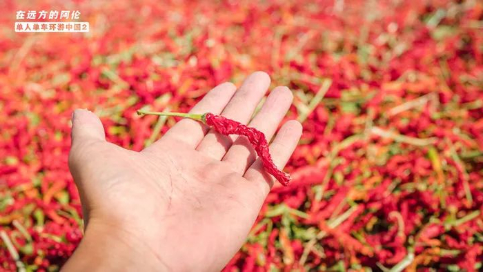从每年的9月开始,安集海的辣椒就进入了采摘的季节,这里的辣椒种植户就会雇佣工人到农田采摘辣椒,然后用拖拉机运到这个晒场上晒干水分。这每一块儿红色的地毯,就代表着一家人的辣椒。